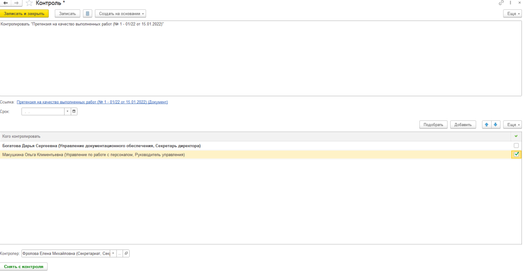 Контролируемый объект, в «Кого контролировать», будет доступ к «Проконтролировано». Если же здесь выбрано несколько исполнителей, то имеется возможность простановки флажка напротив того, кто из исполнителей завершил свою задачу.