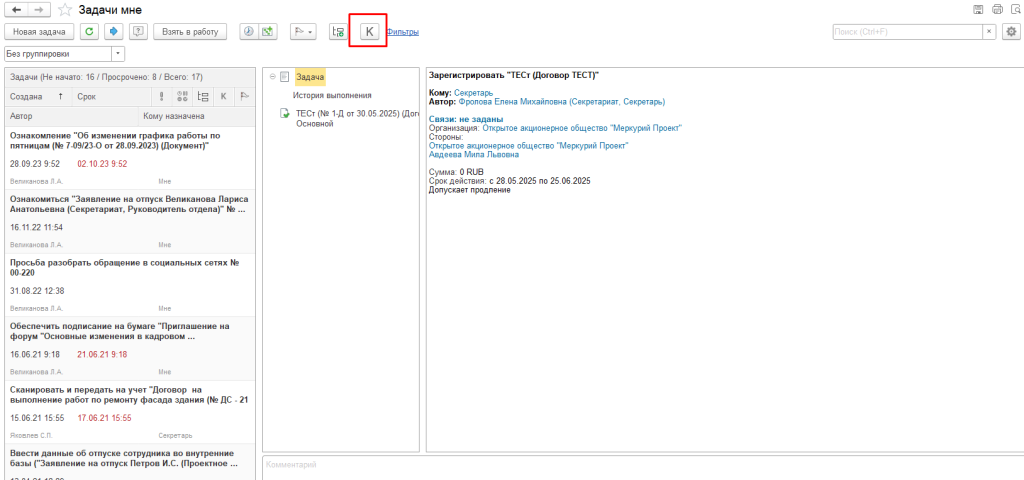 Из раздела «Задачи мне» также имеется возможность постановки, путем нажатия команды «К»