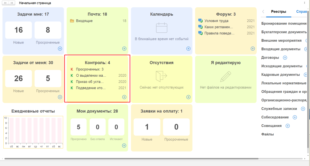 • На контроле – находящиеся на контроле карточки у определенного сотрудника;