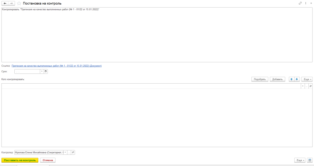 При выполнении данной команды, будет открыта контрольная карточка, в которой необходимо будет указать: Кого контролировать, Контролера, Что контролировать, Срок.