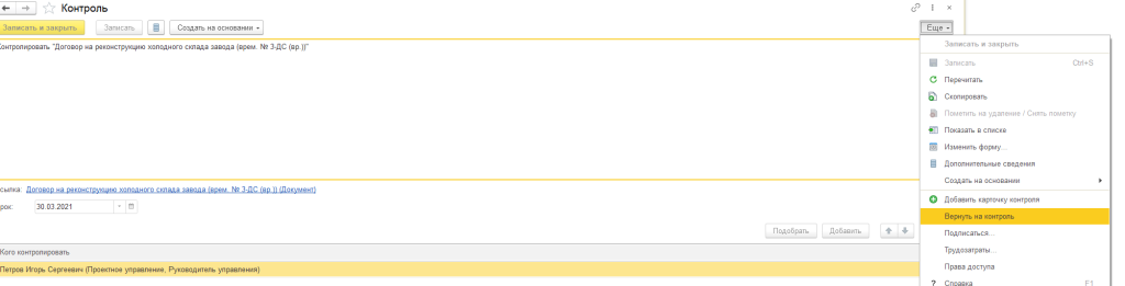 Установка объекта путем нажатия команды «Контроль» или в меню Еще – – Документы, а также в карточке документа, в общем списке документов.