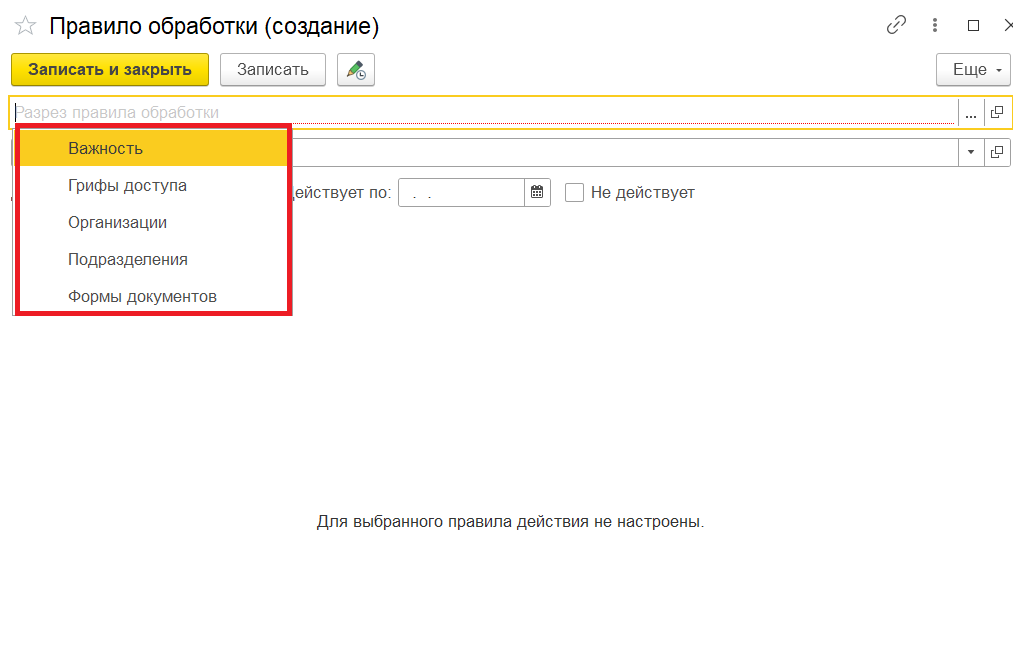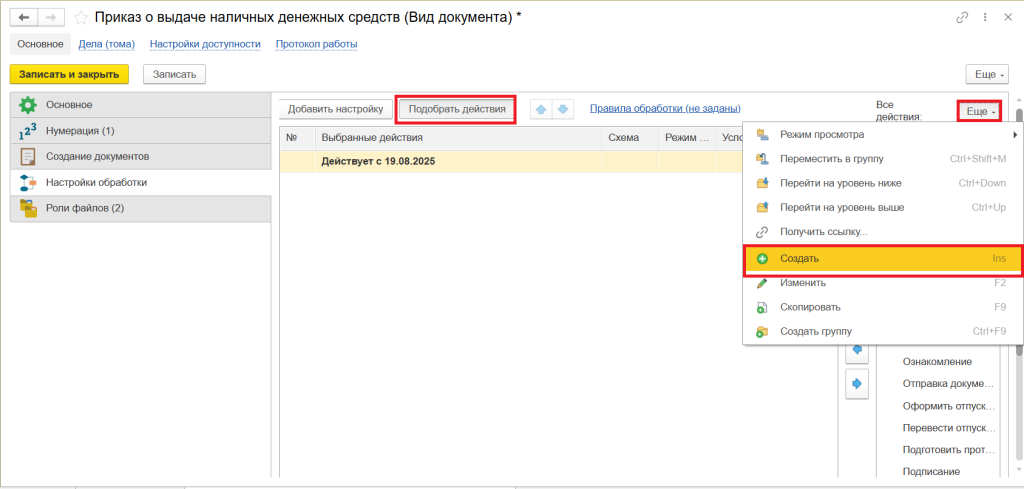 Далее добавить действие в обработку, и затем добавить последующие. Записать документ.