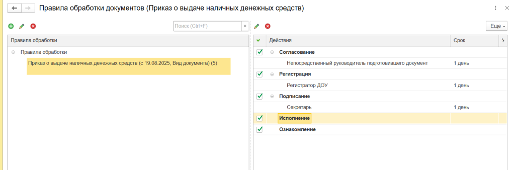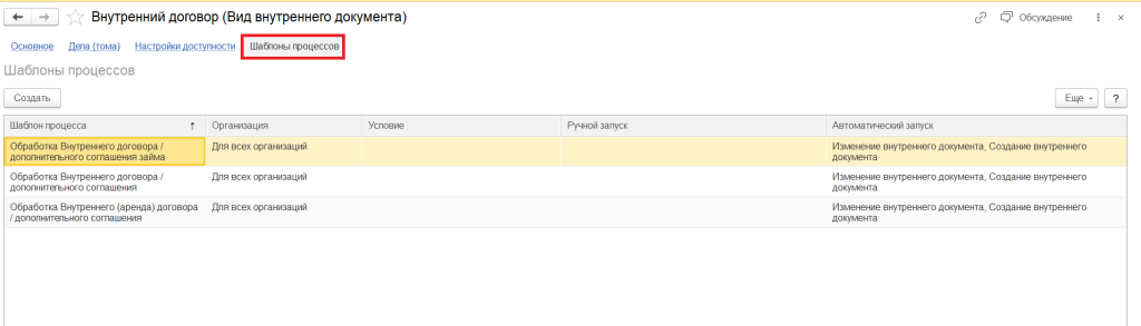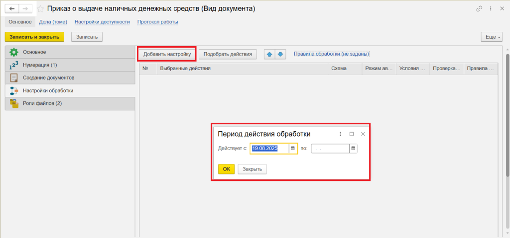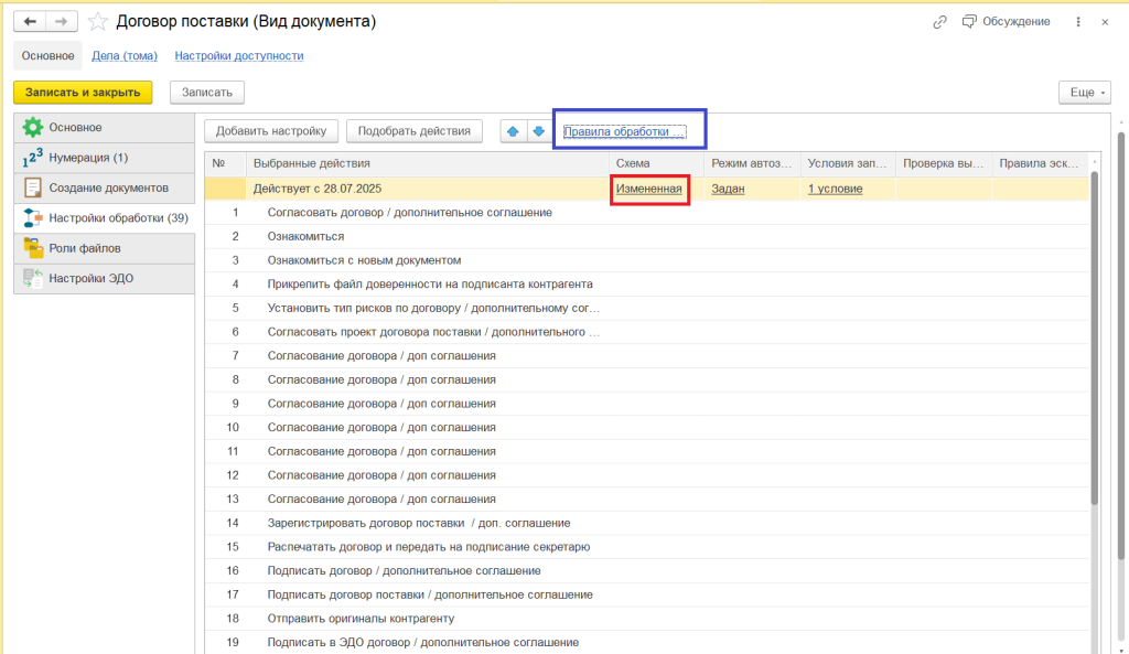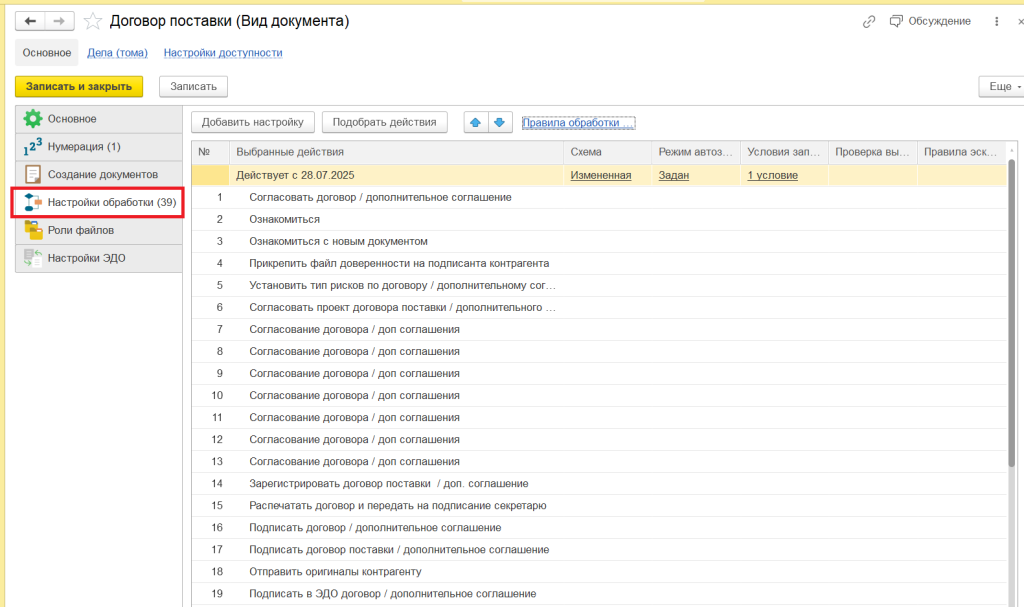 Для настройки процесса по виду документа необходимо перейти в виде документа на вкладку «Обработка» и там добавить новую, действующую с текущей даты или позже.
