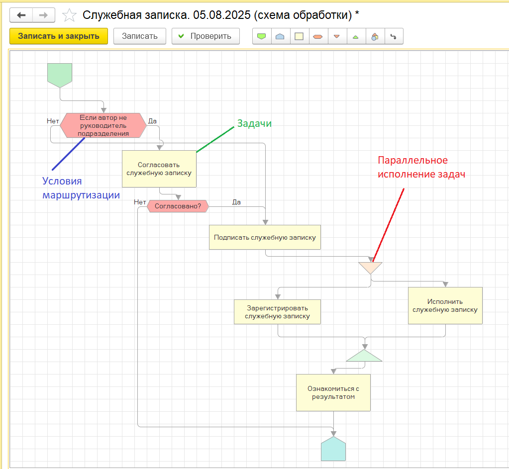 Условия маршрутизации можно внести как в самих правилах обработки по конкретным участникам, так и в схеме обработки. Разница в том, что в правилах обработки условие можно указать конкретно по участнику процесса, например, при каком условии он согласует, а при каком – нет.