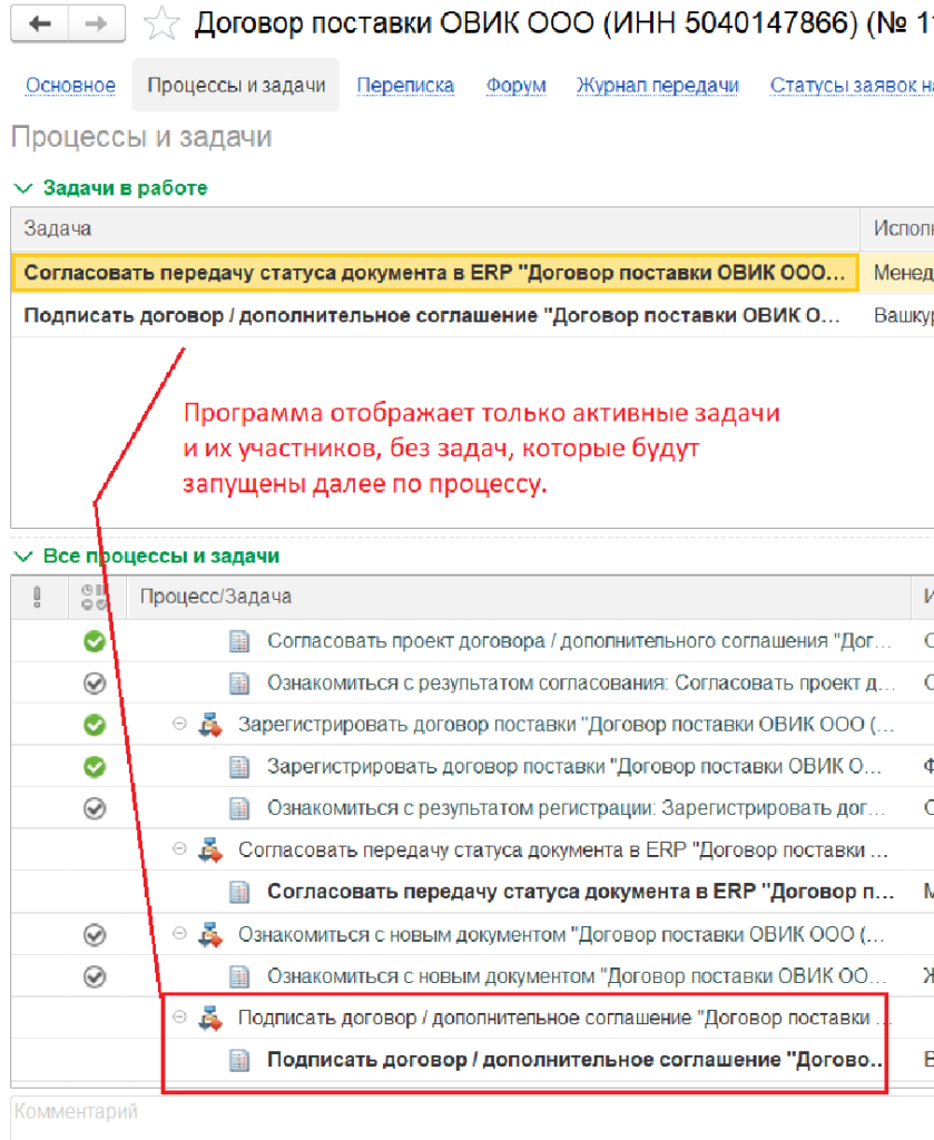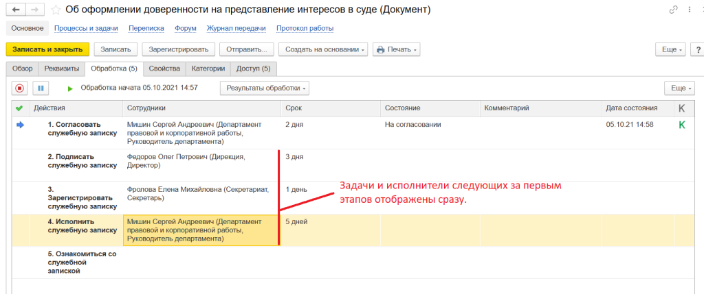 Несмотря на удобство нового функционала по отображению всего процесса и его участников сразу в документе, у этого функционала есть недостаток. Программа отображает все задачи, которые вообще настроены по документу, и в случае сложных процессов, некоторые задачи могут не запускаться по условиям маршрутизации. Но программа все равно будет отображать их в списке, что может сбивать пользователей с толку.